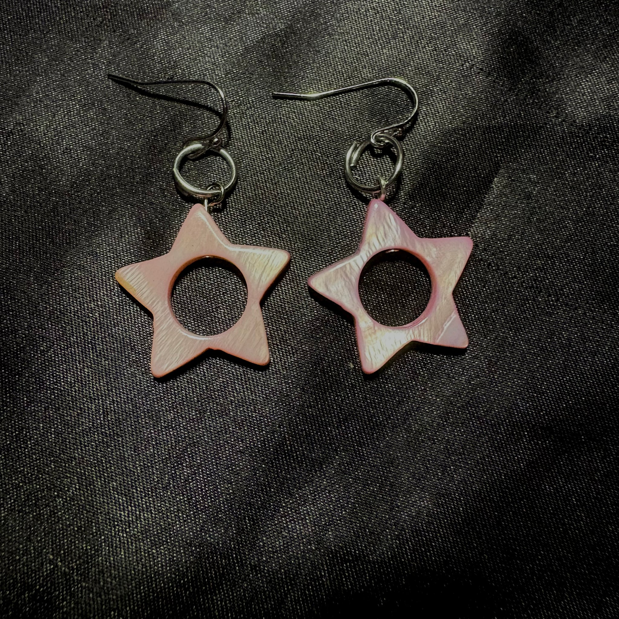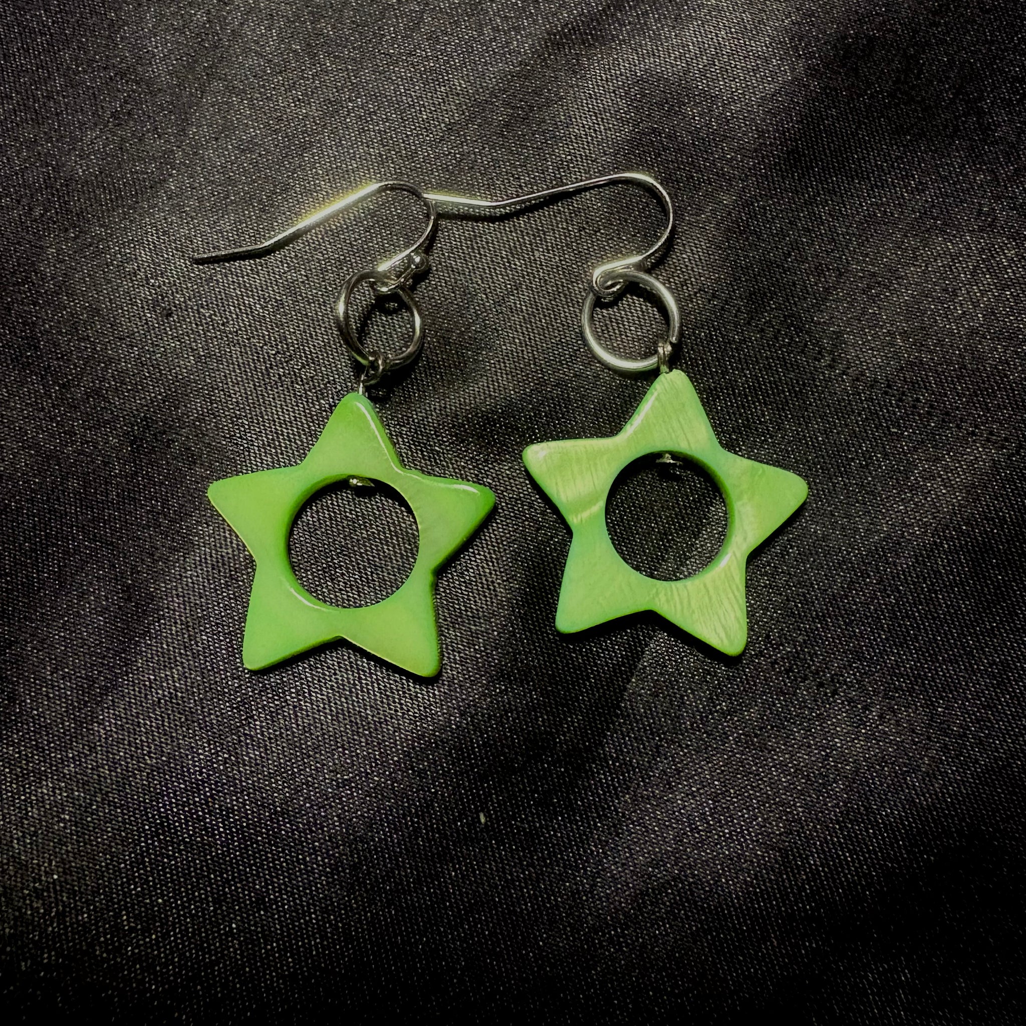 These stars come in a soft punk and a light green. Earring metal is hypoallergenic surgical steel.